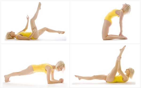 - La cobra: acostado sobre el abdomen, extiende ambos brazos por delante de la cabeza y apoya ambas manos sobre el suelo. Eleva lentamente el abdomen del suelo, realizando un arqueo abdominal.