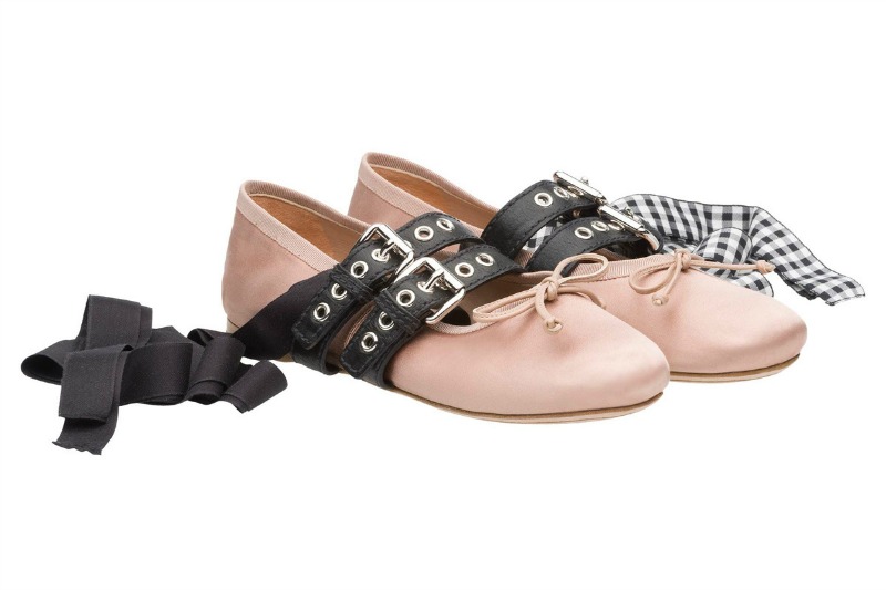 Bailarinas de satén, correas de cuero y cintas de cuadros vichy, de Miu Miu.